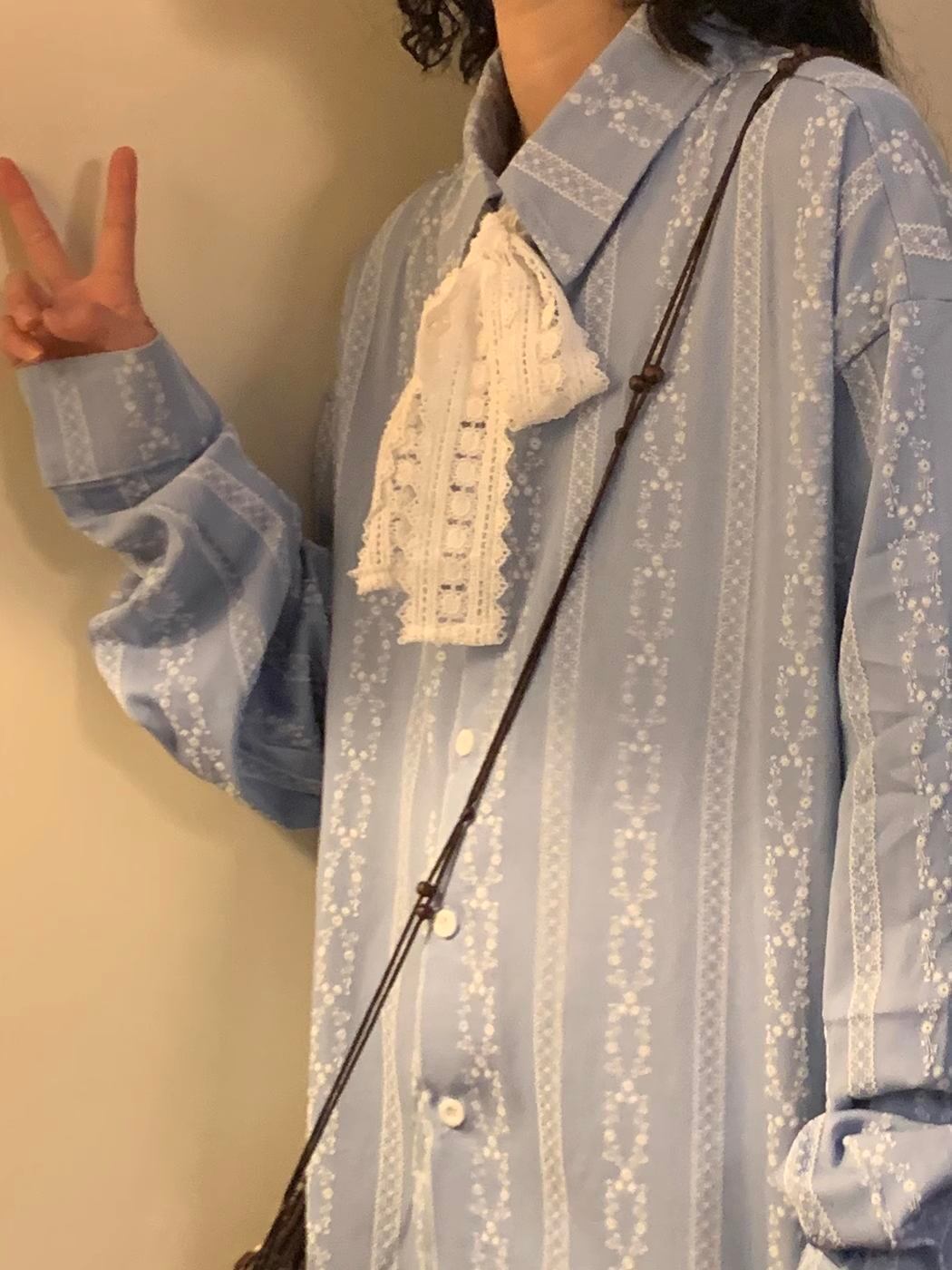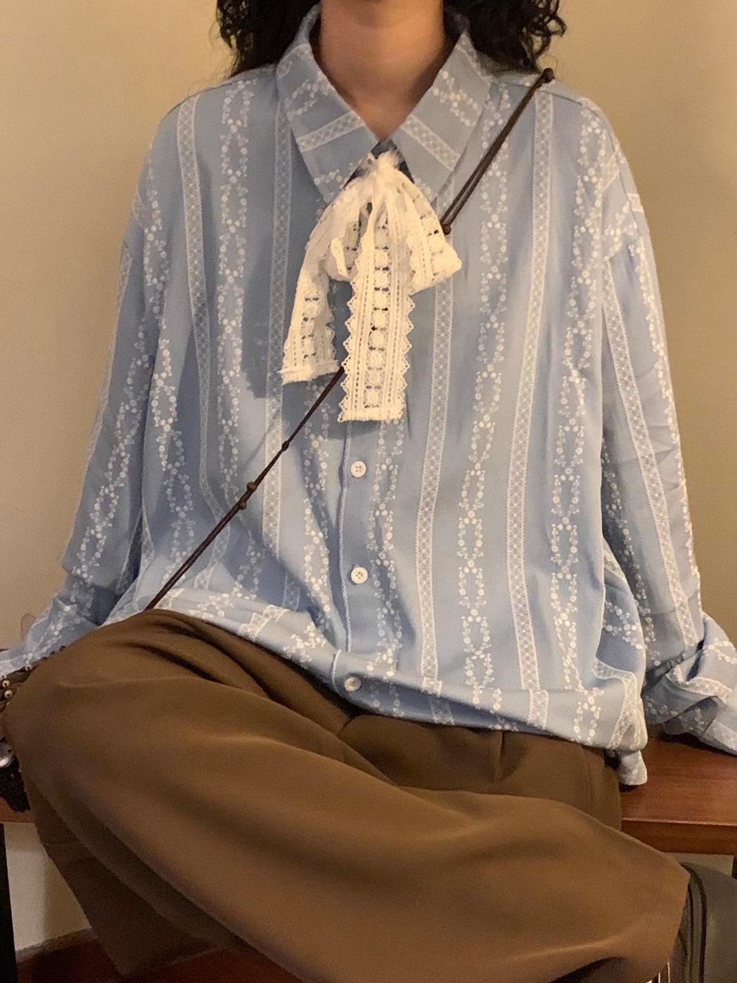 レース柄シャツ ブラウス アメリカンシャツ 長袖 大人カジュアル リボンレース付き 襟付き 春秋 tp1438