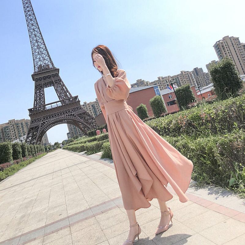 フィッシュテールフレアワンピース ロング丈 カシュクール 七分袖 パフスリーブ バックリボン 春夏秋 フェミニン 大人きれい op0565