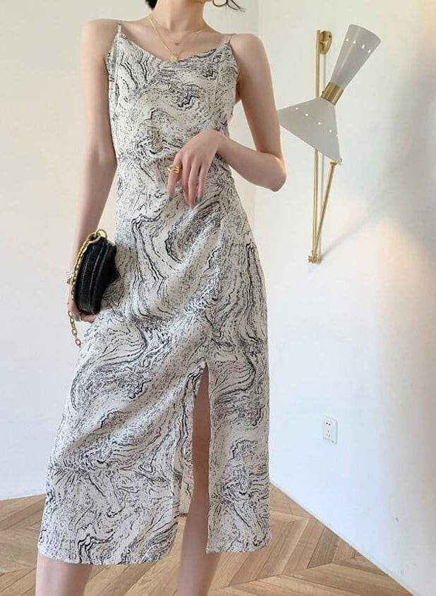 マーブル模様 キャミソールワンピース ロング丈 サイドスリット 大人きれい 大人セクシー エレガント 休日コーデ 春夏 レトロ op0567