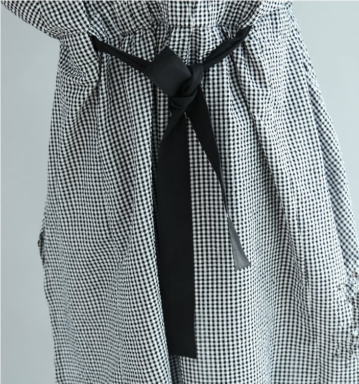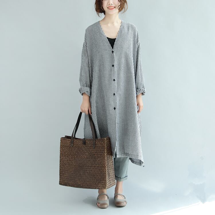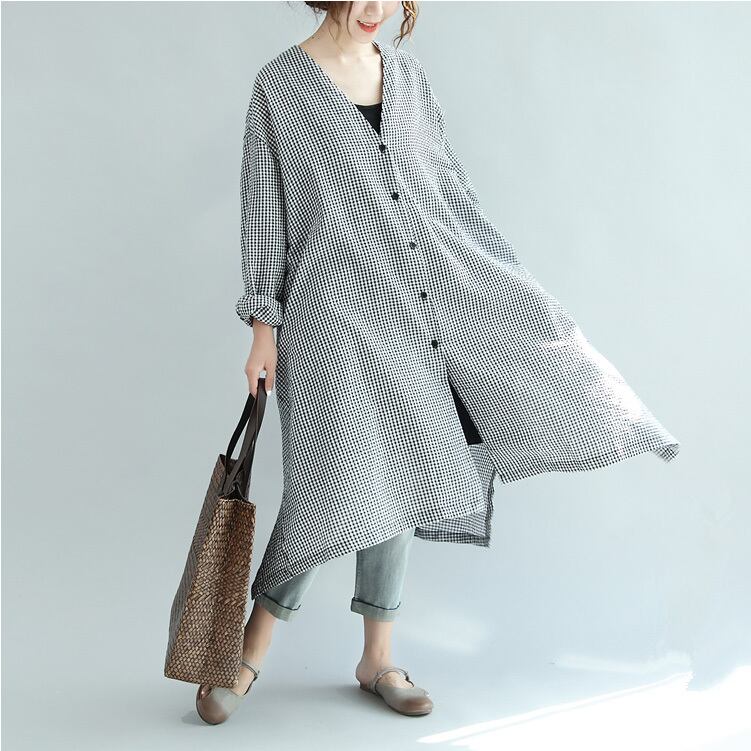 ギンガムチェックシャツワンピース ブラウス ロング丈 長袖 Vネック 春夏秋 大人カジュアル オーバーサイズ tp0835