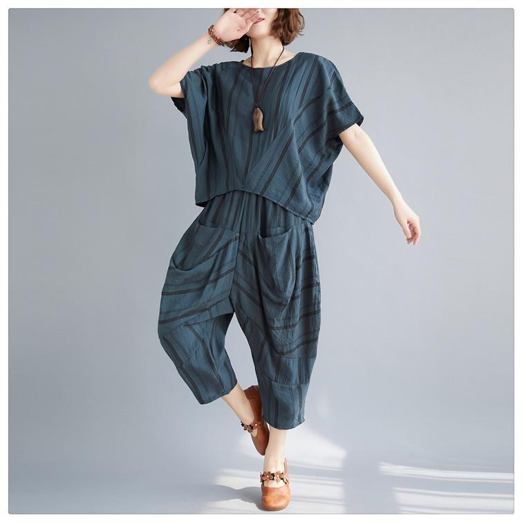 【セットアップ】リネンブレンド ストライプ トップス サルエルパンツ オーバーサイズ 八分丈 半袖 春夏秋 st0272