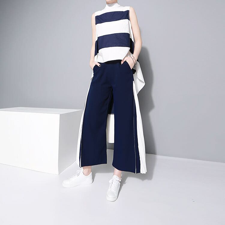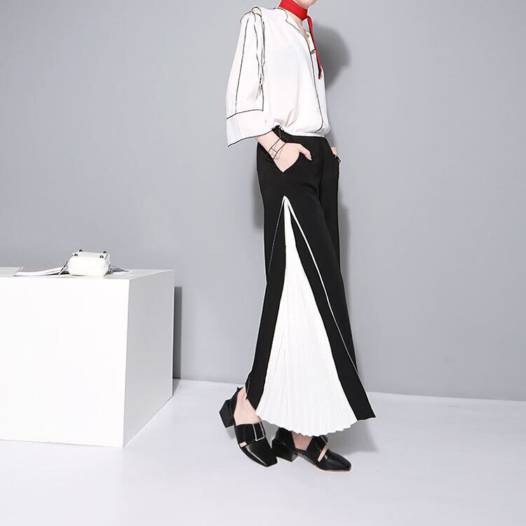 バイカラーワイドパンツ プリーツ切替 シフォン 春夏秋 パイピング 九分丈 オシャレ pt0171