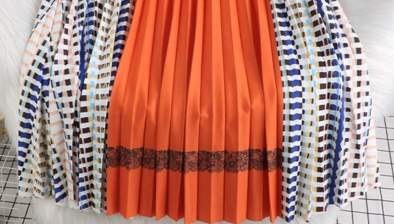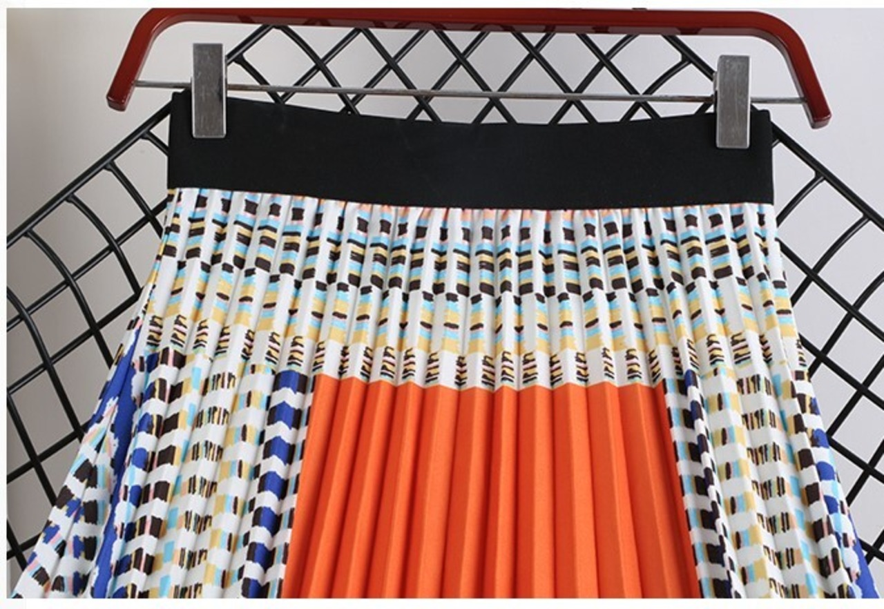 鮮やかな色使いが目を引く柄プリントプリーツスカート。