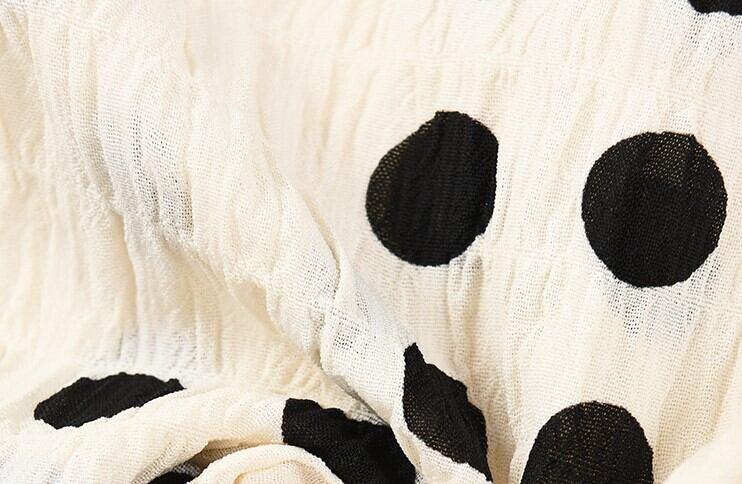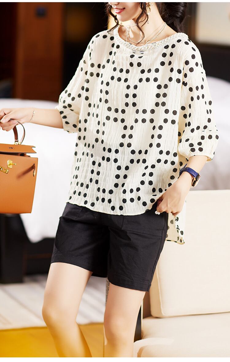 涼し気なしわ加工の素材のドット柄トップス。