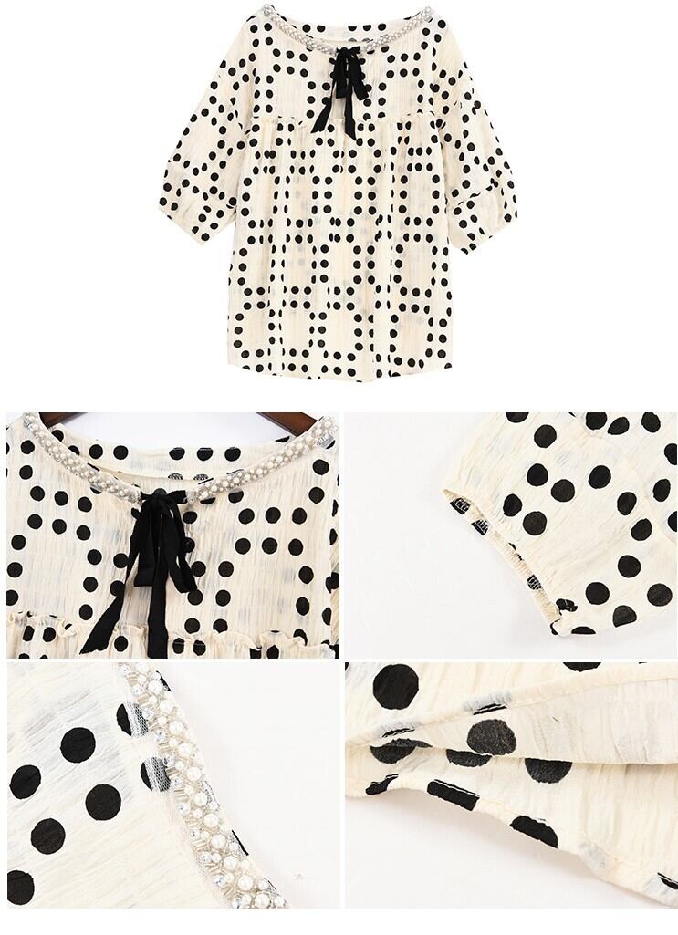 バックリボン ドット柄 しわ加工トップス パール ラウンドネック 五分袖 春夏秋 大人きれい 20代 30代 40代 50代 tp0867