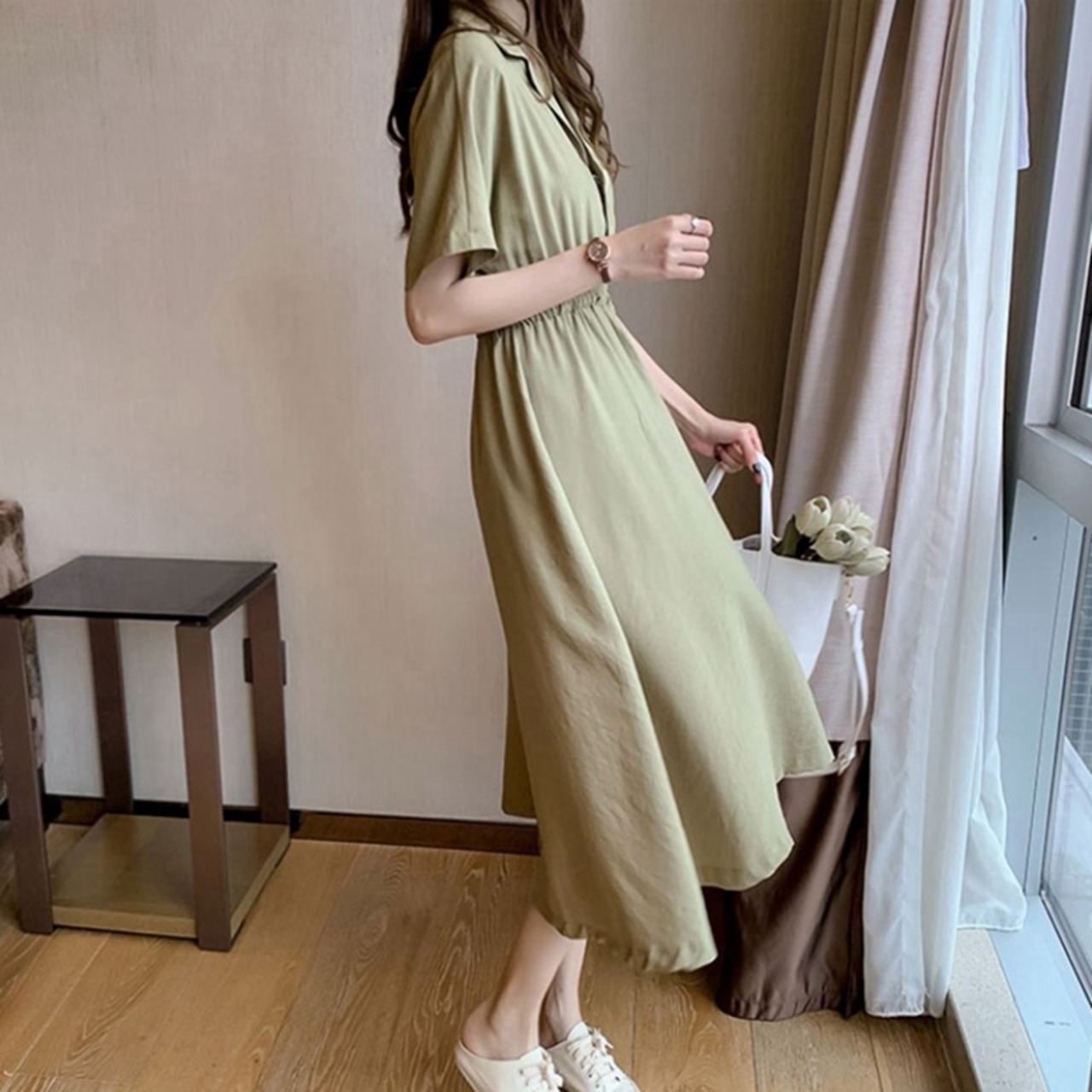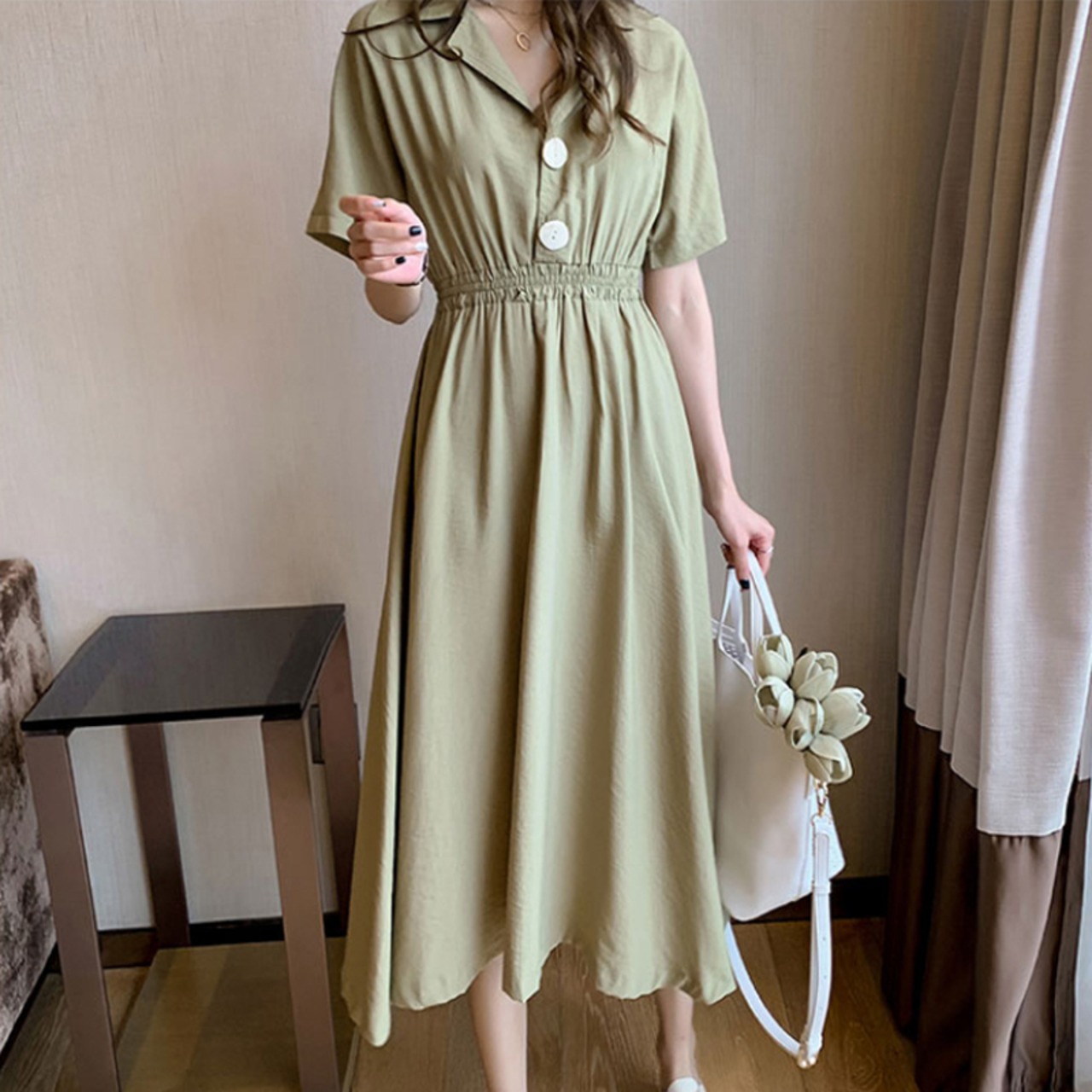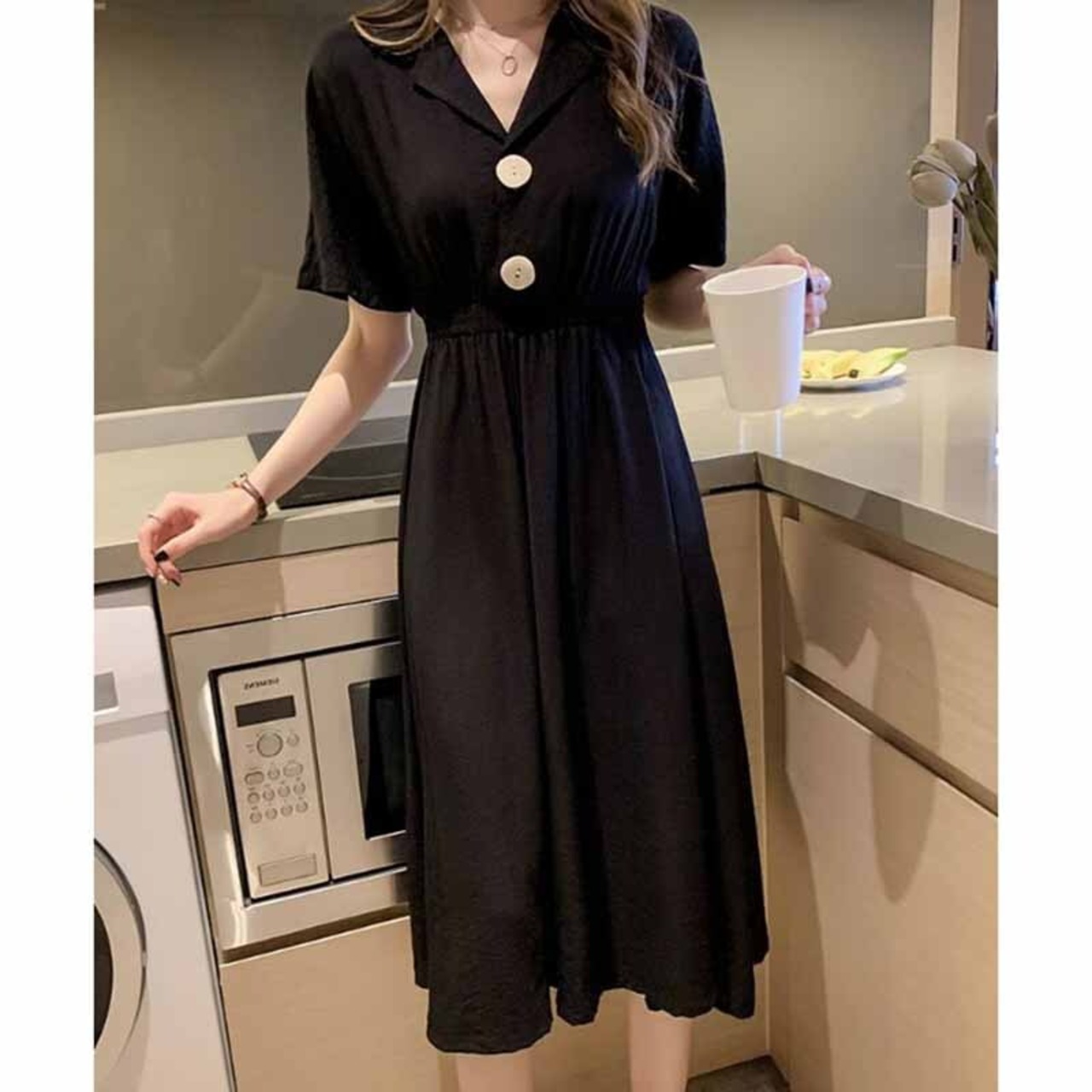 BIGボタンがポイントのミモレ丈襟付きワンピース。