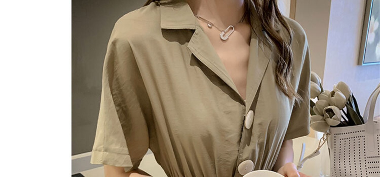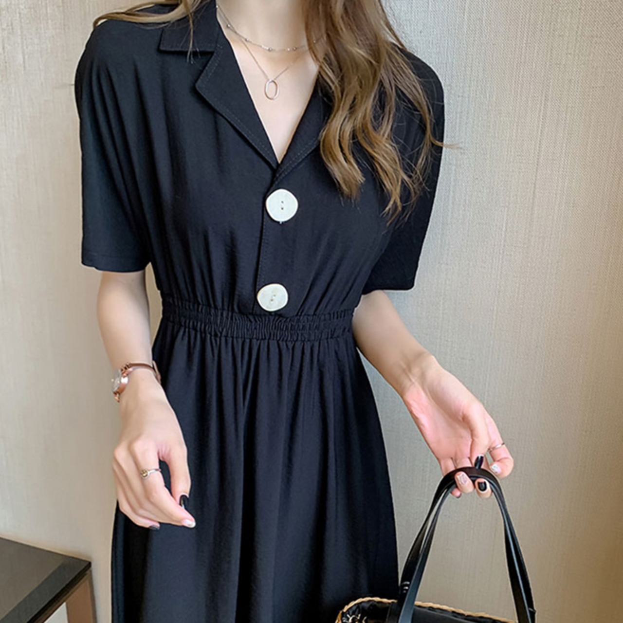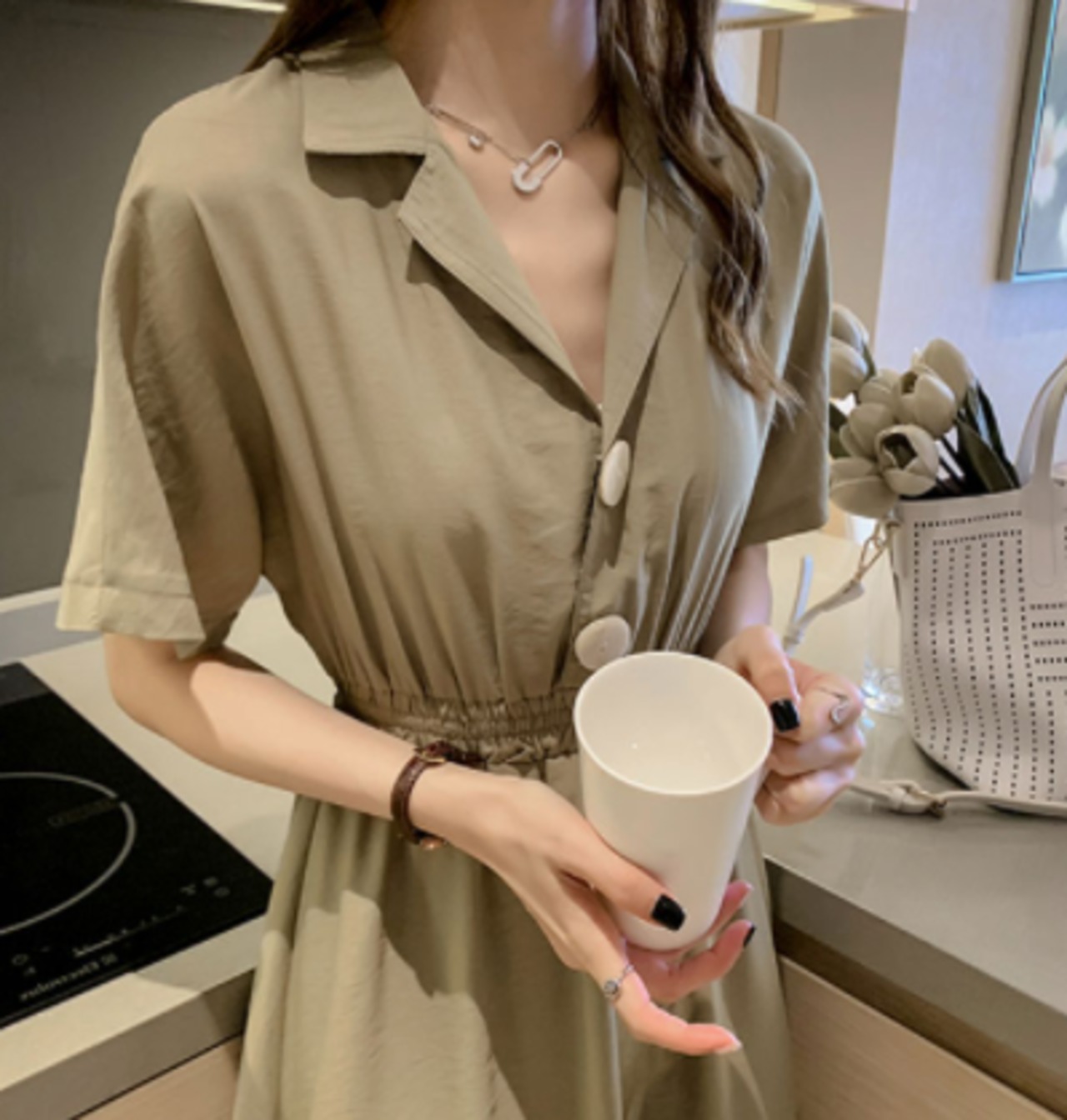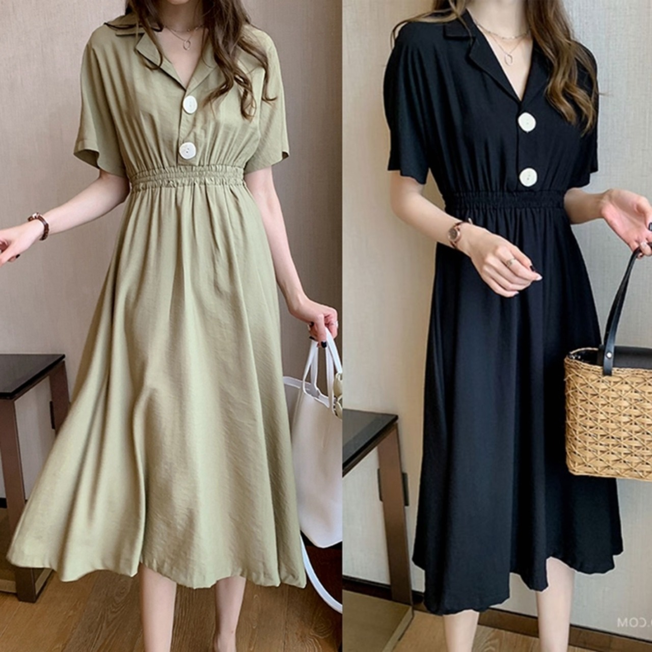 BIGボタンがポイントのミモレ丈襟付きワンピース。