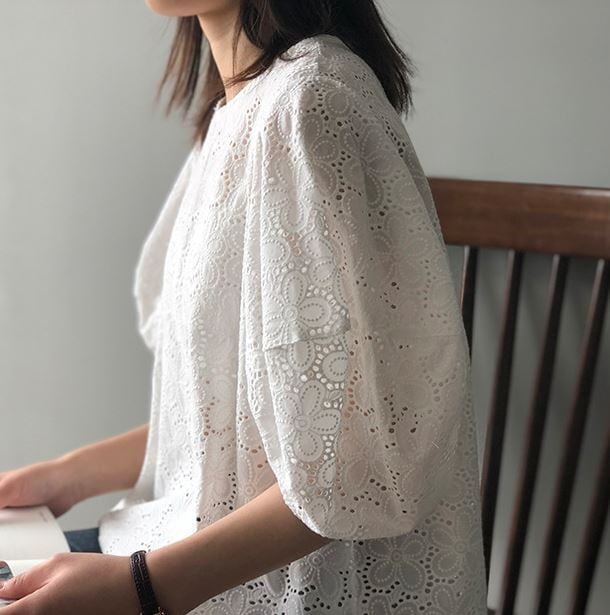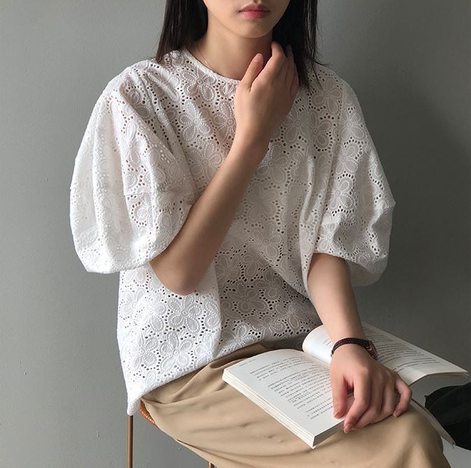 透かしレース パフスリーブブラウス 花柄 半袖 刺繍レース ボリュームスリーブ クルーネック ゆったりコーデ 大人かわいい シンプルデザイン 春夏秋 20代 30代 40代 50代 tp0881
