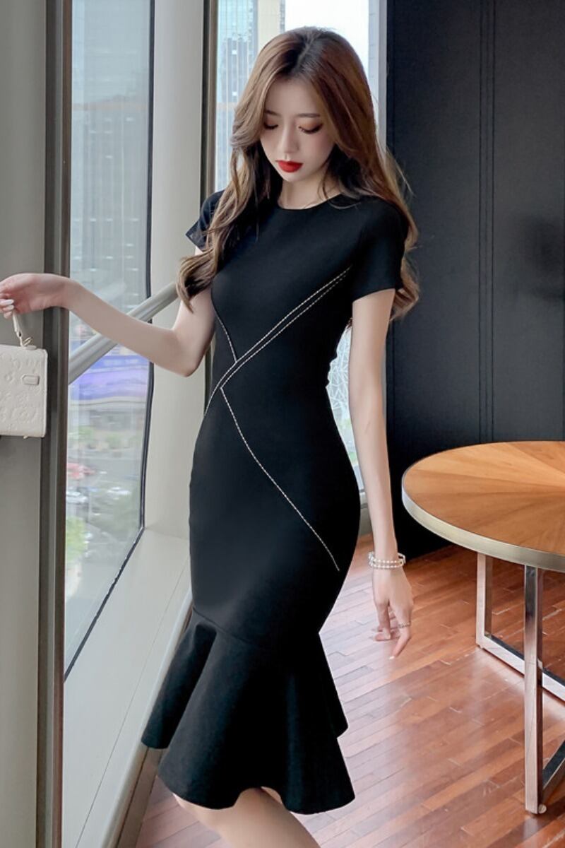 マーメイド ステッチワンピース ひざ丈 モノトーン バックファスナー ラウンドネック 半袖 春夏秋 エレガント 大人きれい 20代 30代 40代 50代 op0603
