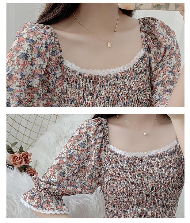 花柄ワンピース シャーリング スクエアネック 五分袖 レース フレアスリーブ ミモレ丈 春夏秋 清楚 大人かわいい 10代 20代 30代 40代 op0605