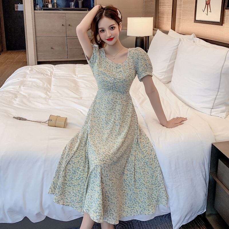 花柄ワンピース バッククロス 半袖 ミモレ丈 バックシャン フレア バックオープン ハイウエスト 春夏秋 大人かわいい フェミニン レトロかわいい 10代 20代 30代 op0609