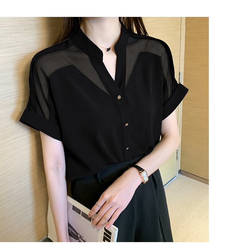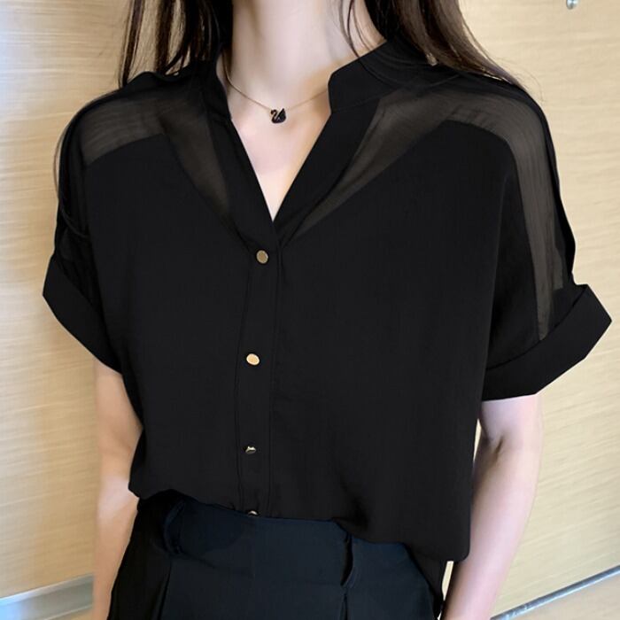 シアー切替 キーネックブラウス 透け感 シフォン シャツ シースルー 半袖 春夏秋 大人きれい オフィスコーデ 20代 30代 40代 50代 tp0891
