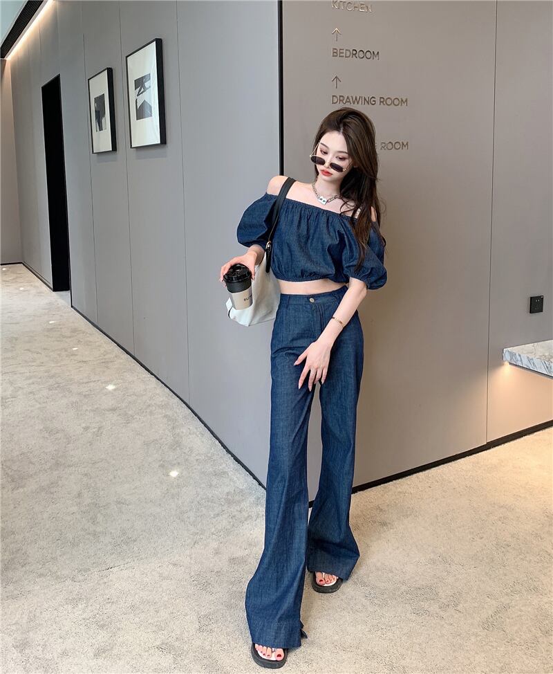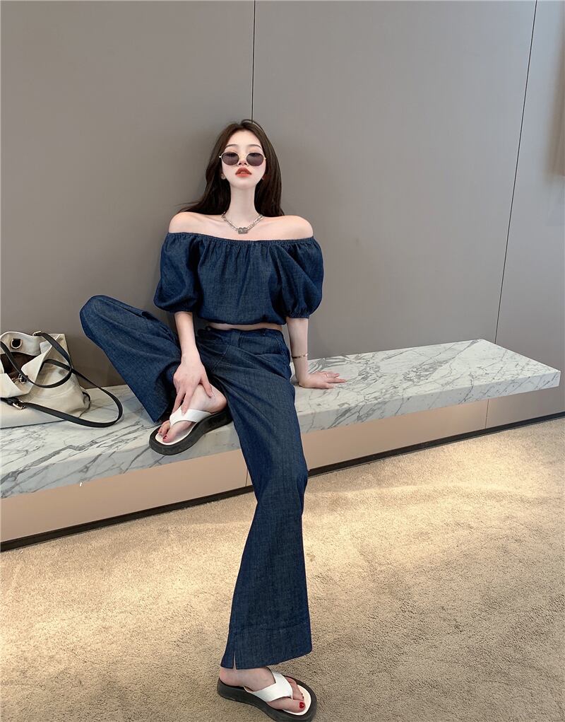【セットアップ】デニムオフショル カットソー ストレートジーンズ パフスリーブ 半袖 春夏秋 大人かわいい カジュアル 10代 20代 30代 40代 st0280