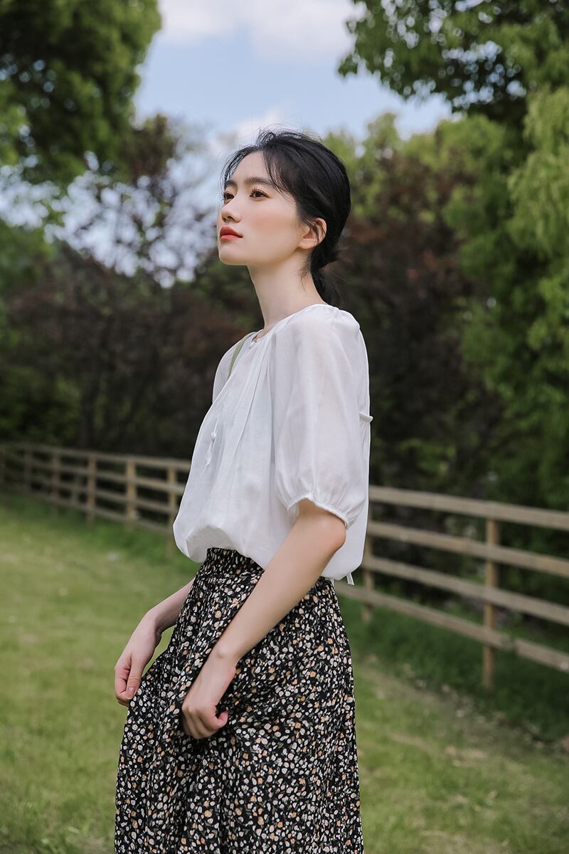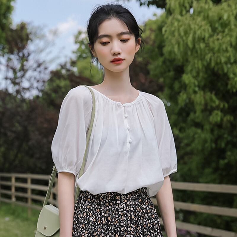 バックダブルリボン シフォンブラウス 半袖 パフスリーブ ラウンドネック センターボタン 大人かわいい 春夏秋 20代 30代 40代 50代 tp0902