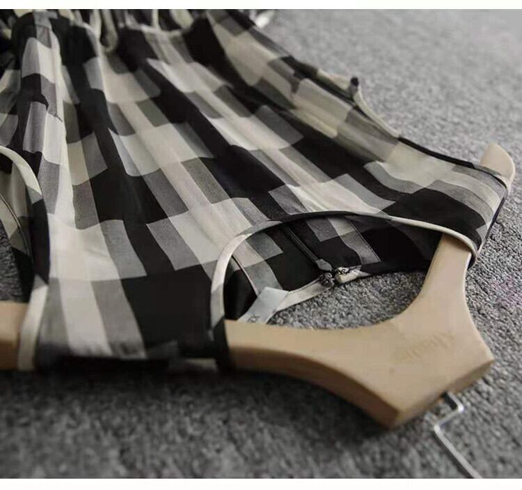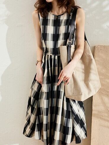 グリッド柄フレアワンピース ノースリーブ ひざ丈 ラウンドネック 春夏秋 大人きれい フェミニン 10代 20代 30代 40代 50代 op0624