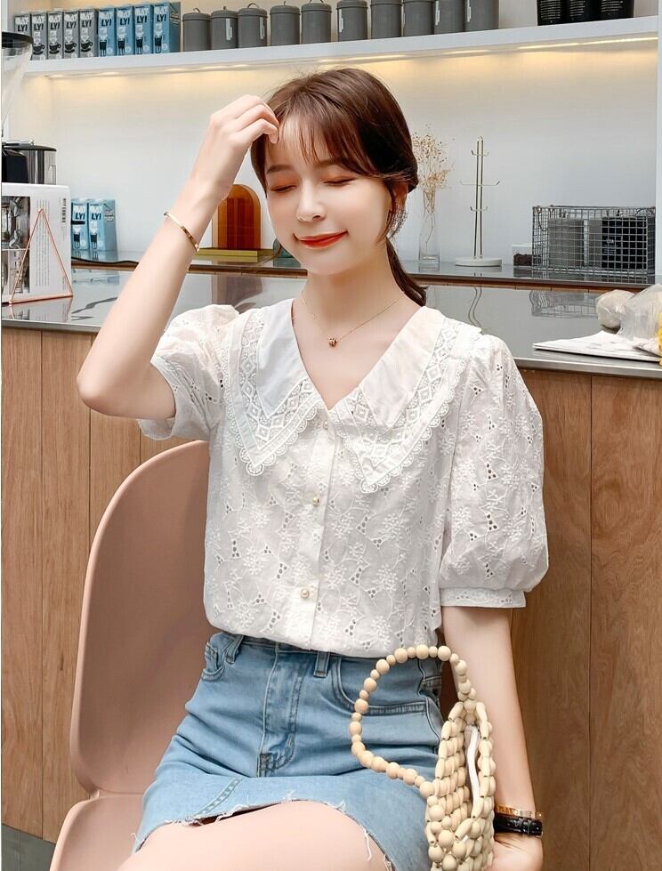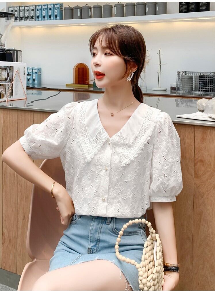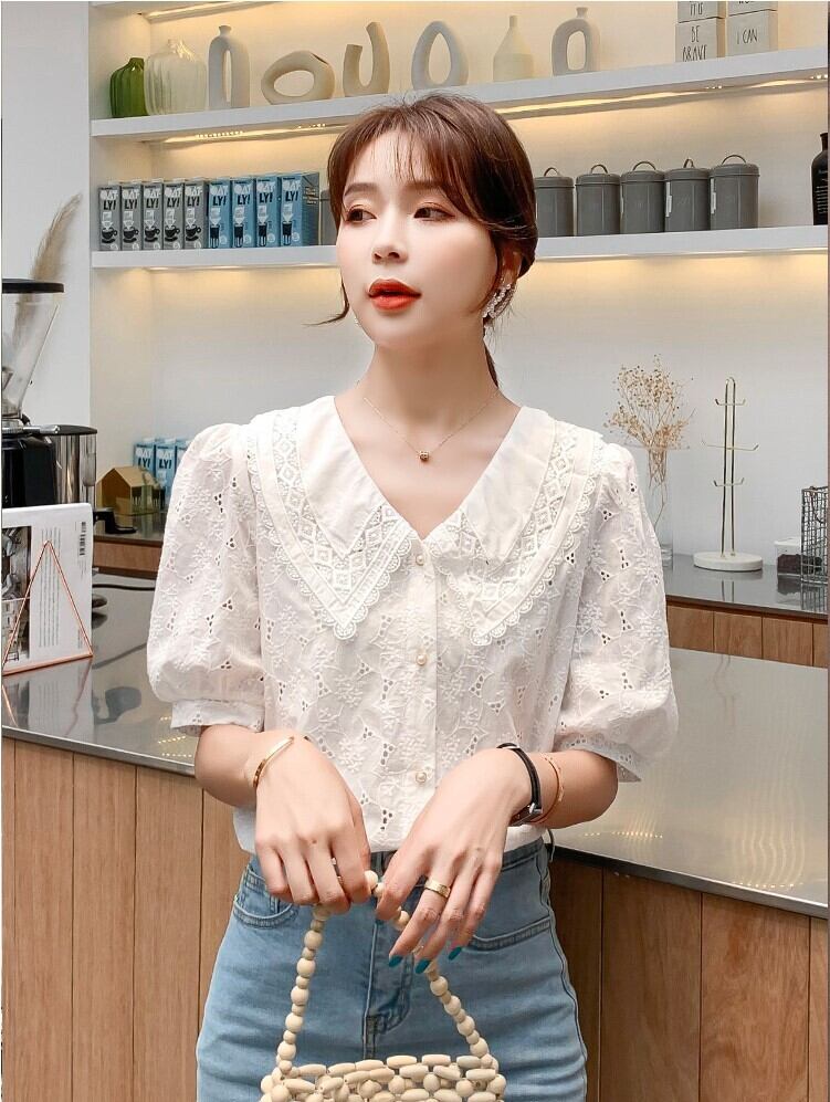 カラーコンシャスシャツ パンチング 半袖 レース 花柄 刺繍 パフスリーブ Vネック センターボタン 大人かわいい 春夏秋 10代 20代 30代 40代 tp0910