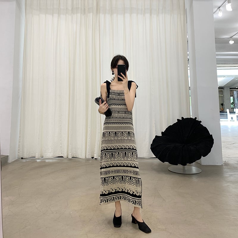 アラベスク柄のIラインワンピース。