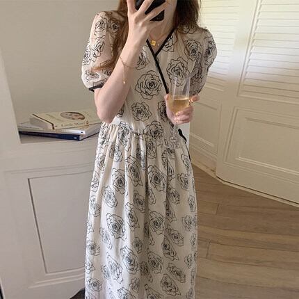 ローズ柄ワンピース カシュクール モノトーン パイピング 春夏秋 大人かわいい お出かけ 20代 30代 40代 50代 op0626