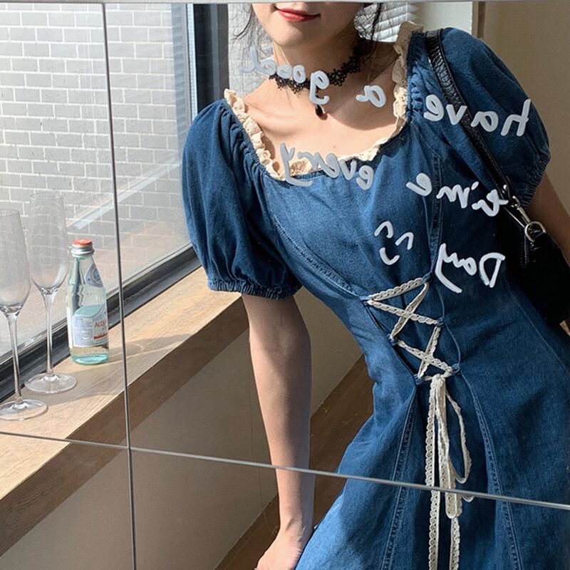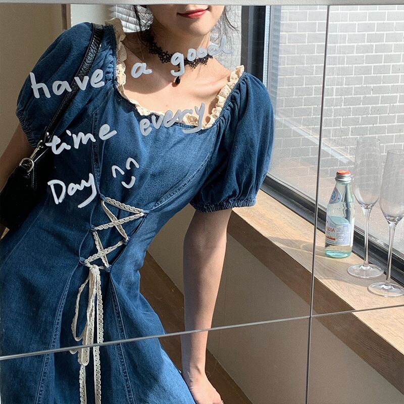 デニムフレアワンピース パフスリーブ レースアップ 編み上げ ミニ丈 春夏秋 大人かわいい ガーリー 10代 20代 30代 op0630