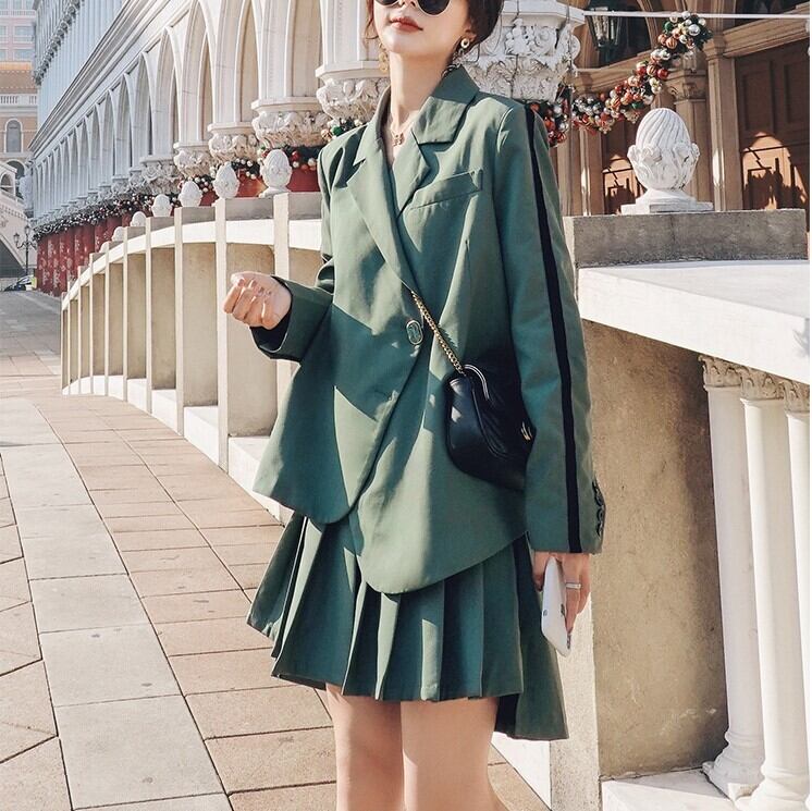たっぷりおしゃれポイントを詰め込んだジャケットとプリーツスカートのセットアップ。
