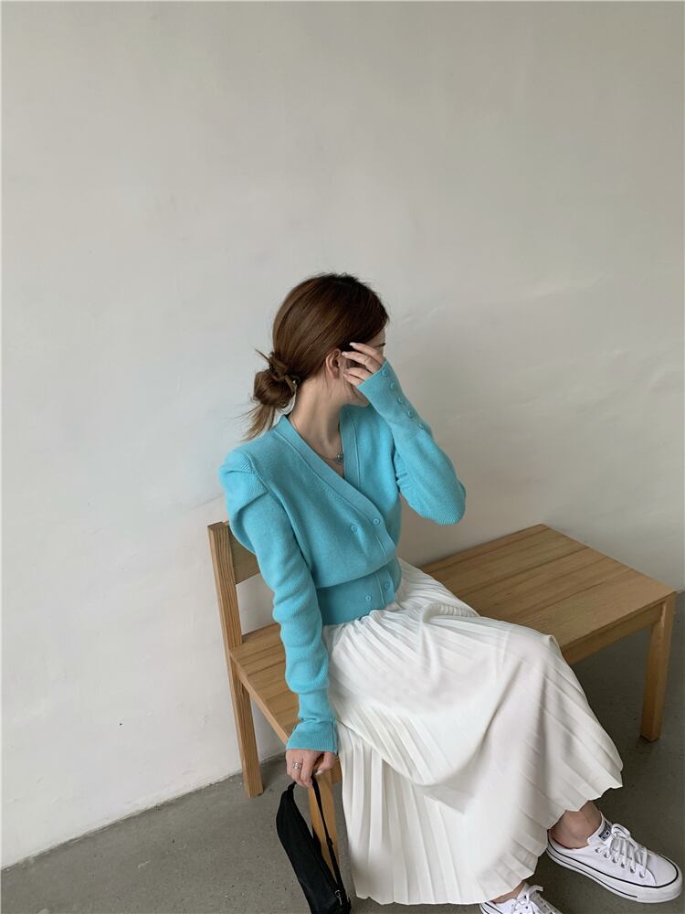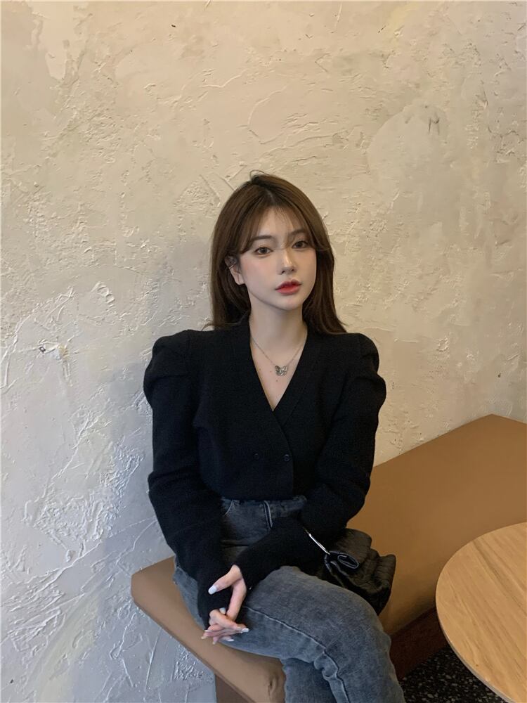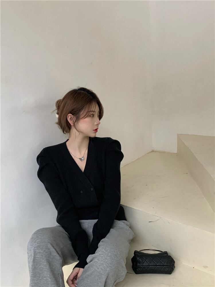 パフスリーブカーディガン 長袖 Vネック 春秋 大人きれい シンプル 10代 20代 30代 40代 50代 tp0922