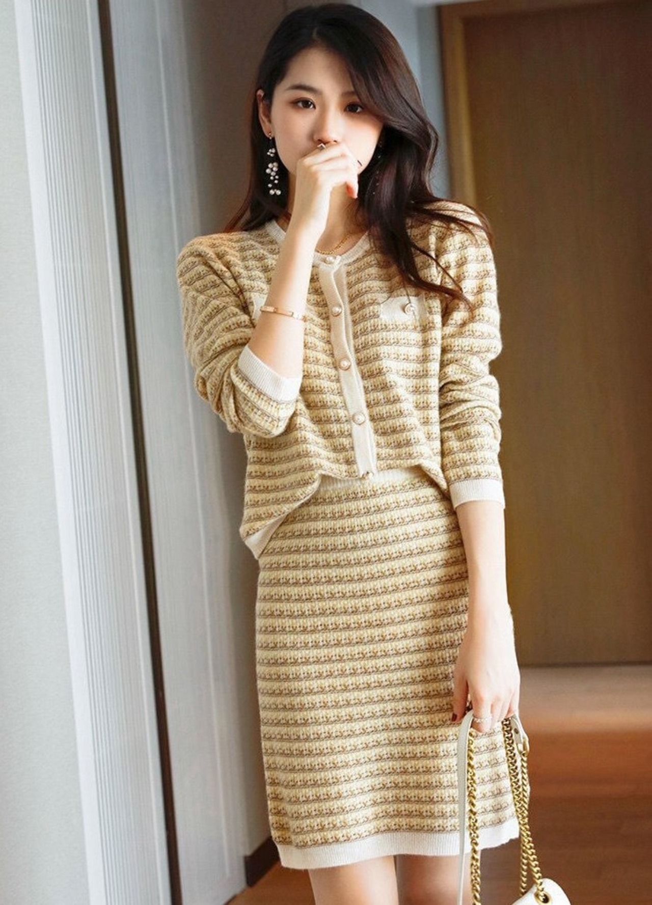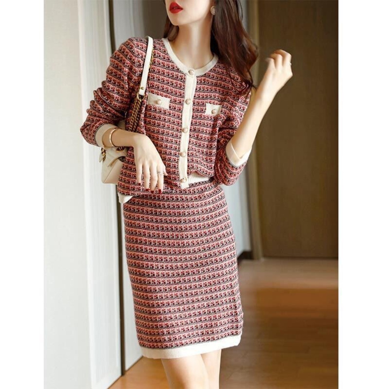 ミックスカラーのカーディガン+ミニ丈スカートのセットアップ商品です。