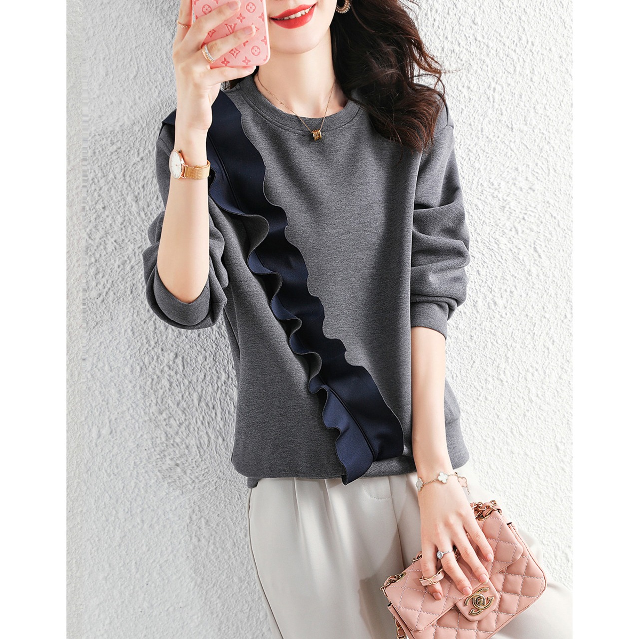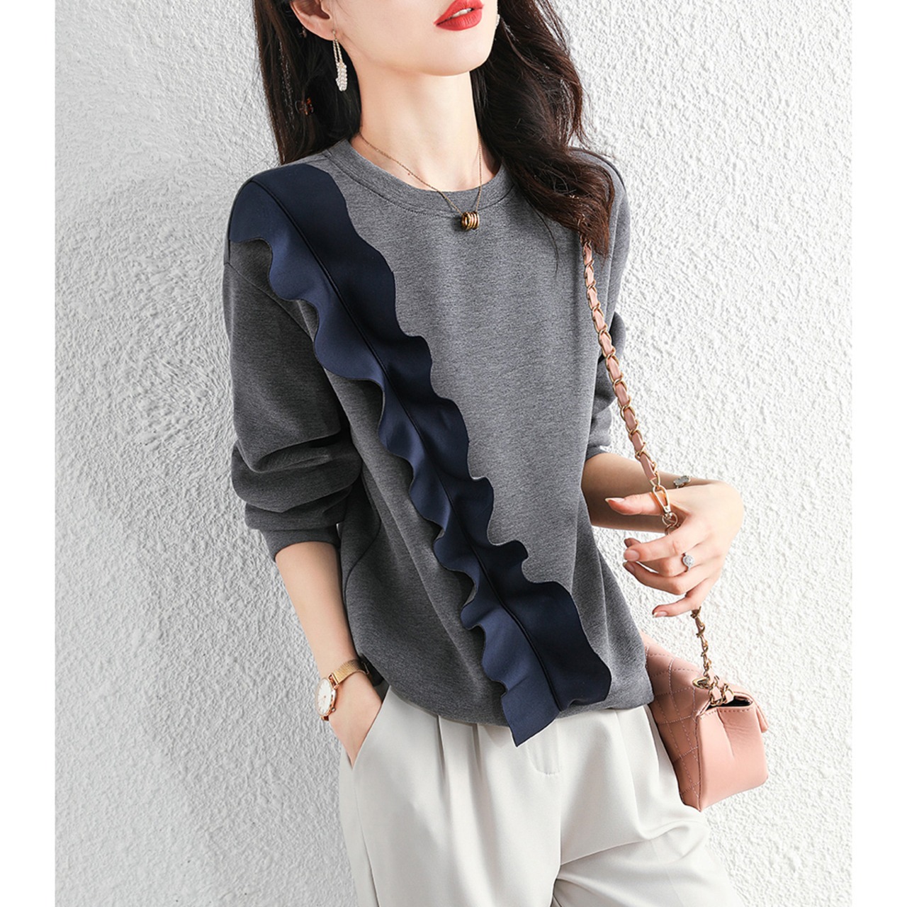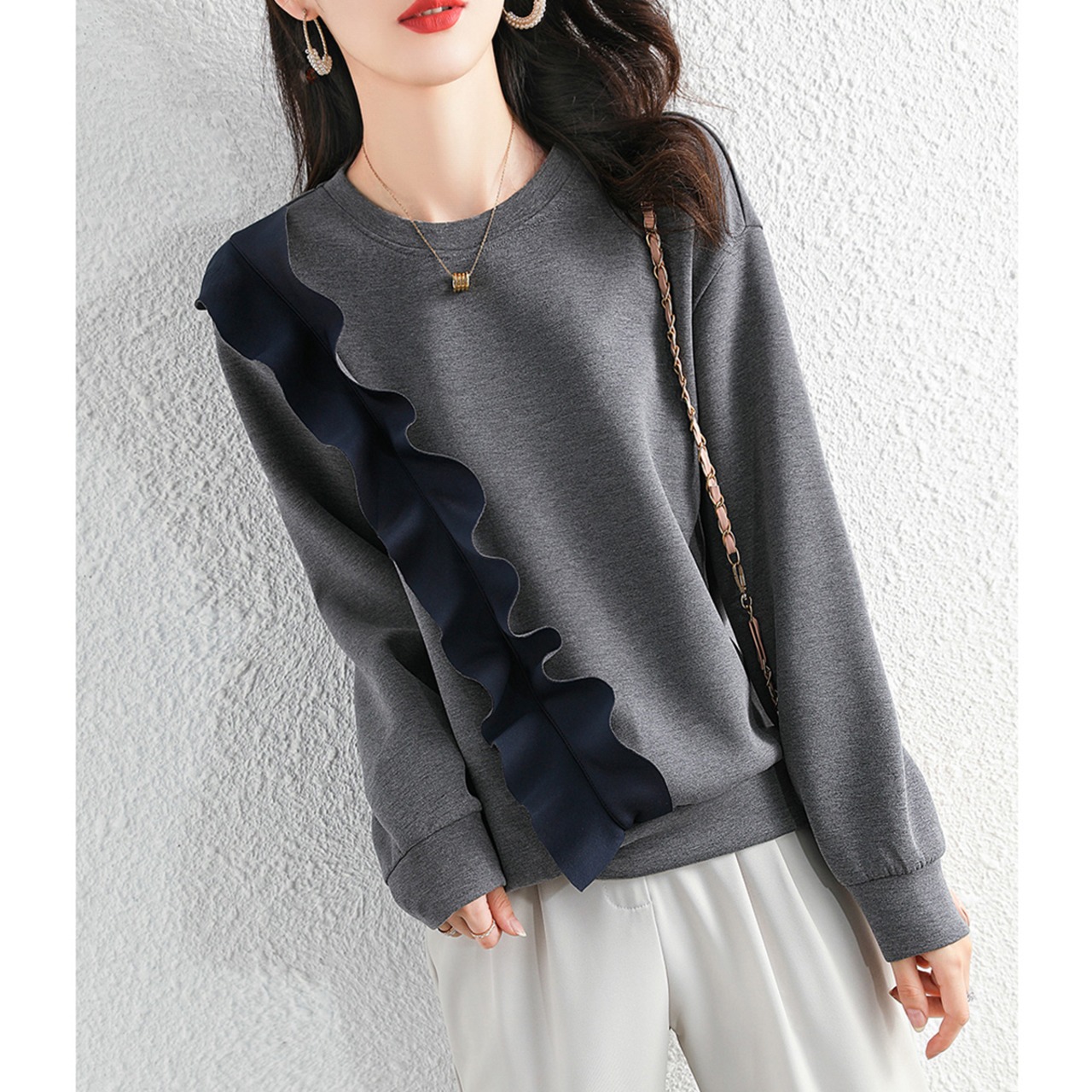 フリルトレーナー プルオーバー バイカラー 長袖 春秋冬 大人カジュアル ラウンドネック 20代 30代 40代 50代 tp0942