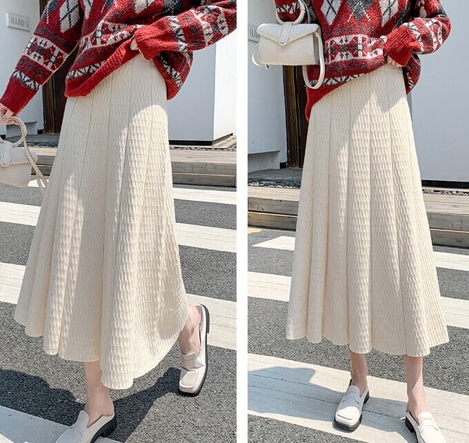 ウエーブ編みの布地を使ったミモレ丈スカート。