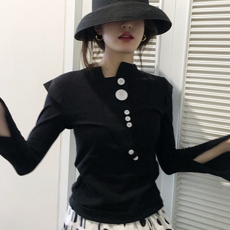 デザイン リブカットソー ボタン ショルダーフリル 袖スリット 春秋冬 大人きれい 個性的 10代 20代 30代 40代 50代 tp0961