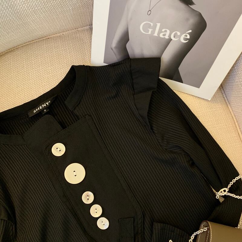 いくつものボタンが並んだリブカットソー。