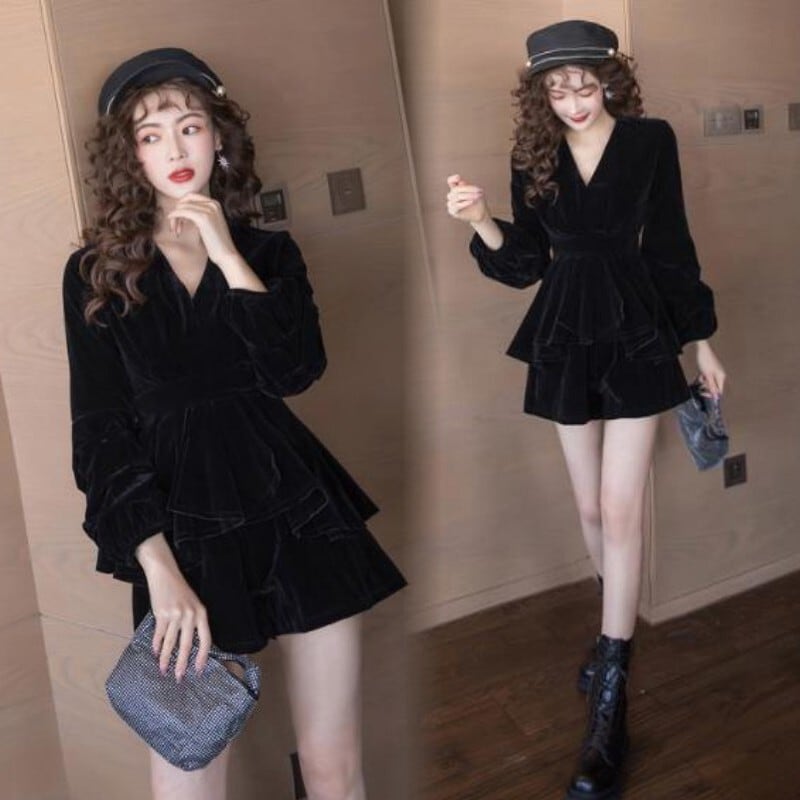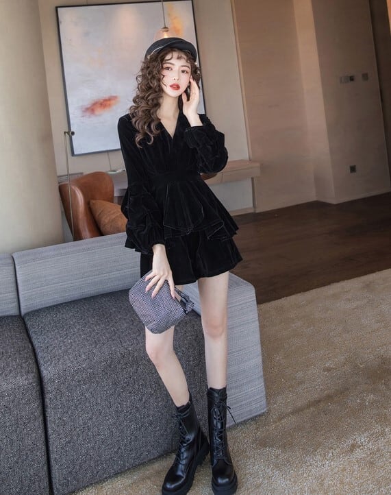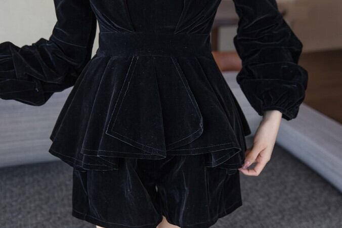 【セットアップ】ベロアカットソー ショートパンツ ティアード パフスリーブ Vネック 長袖 秋冬 大人かわいい 10代 20代 30代 40代 st0301