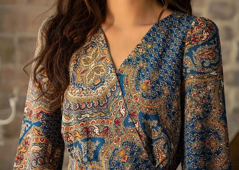 ボヘミアン柄フレアワンピース カシュクール マキシ丈 ティーアード 長袖 春秋 大人きれい 20代 30代 40代 50代 op0652