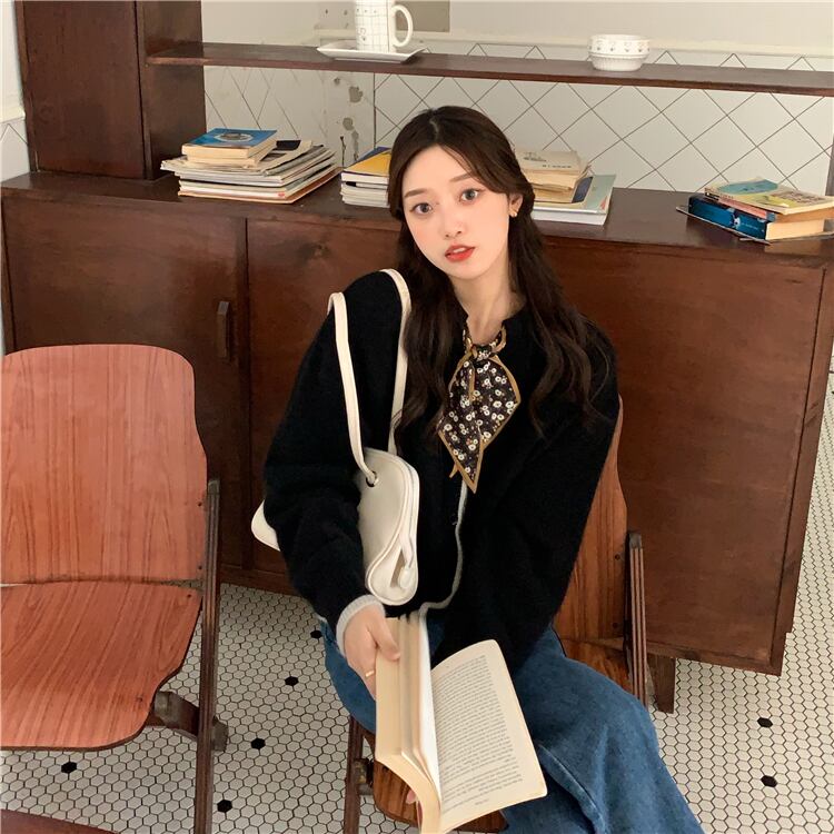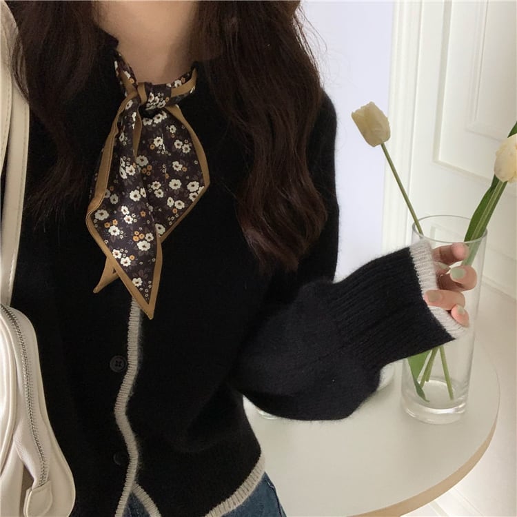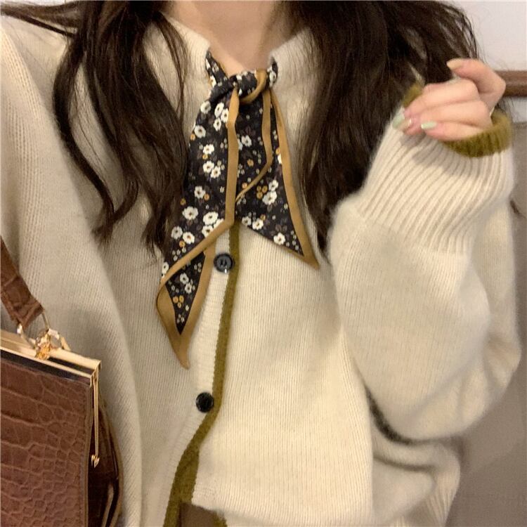 スカーフニットカーディガン 小花柄 長袖 ラウンドネック バイカラー 春秋冬 大人かわいい ガーリー 10代 20代 30代 40代 tp0969