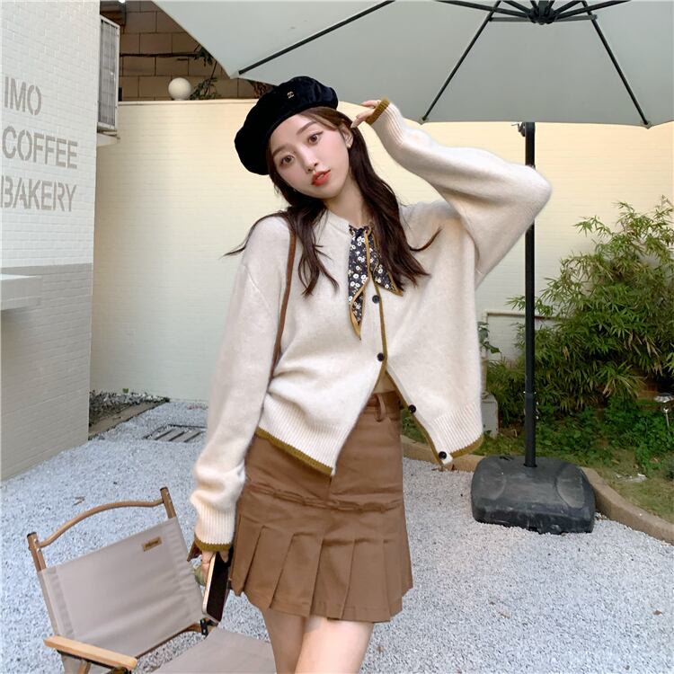 パイピングカラーがおしゃれなニットカーディガン。
