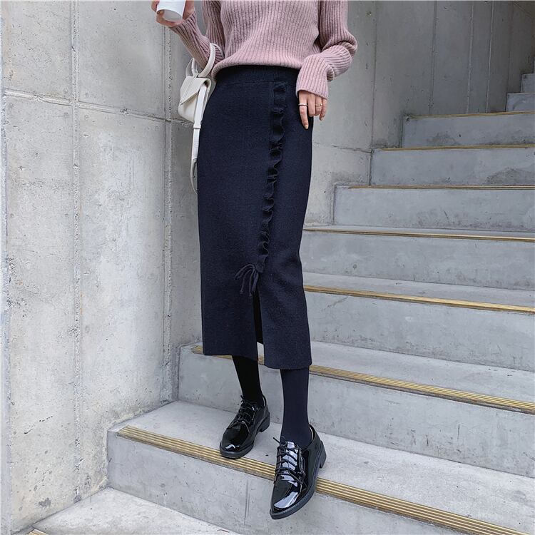 ニットスカート タイト ミモレ丈 フリル スリット リボン 春秋 大人きれい ウエストゴム 20代 30代 40代 50代 sk0263