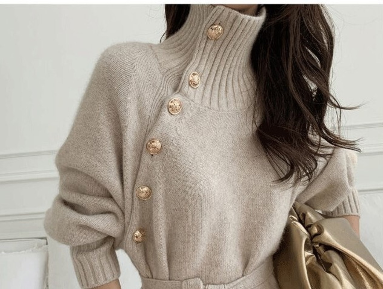 ハイネックニットワンピース ロング丈 秋冬 大人きれい ボタン シンプル 20代 30代 40代 50代 op0656
