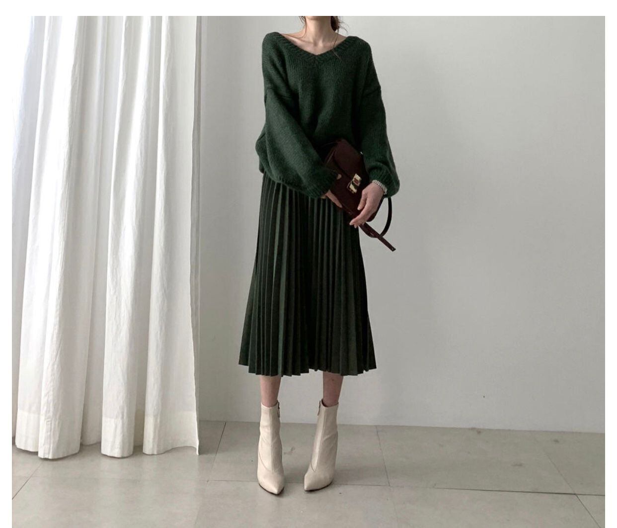 ざっくり着られるVネックニットとプリーツスカートのセットアップ。