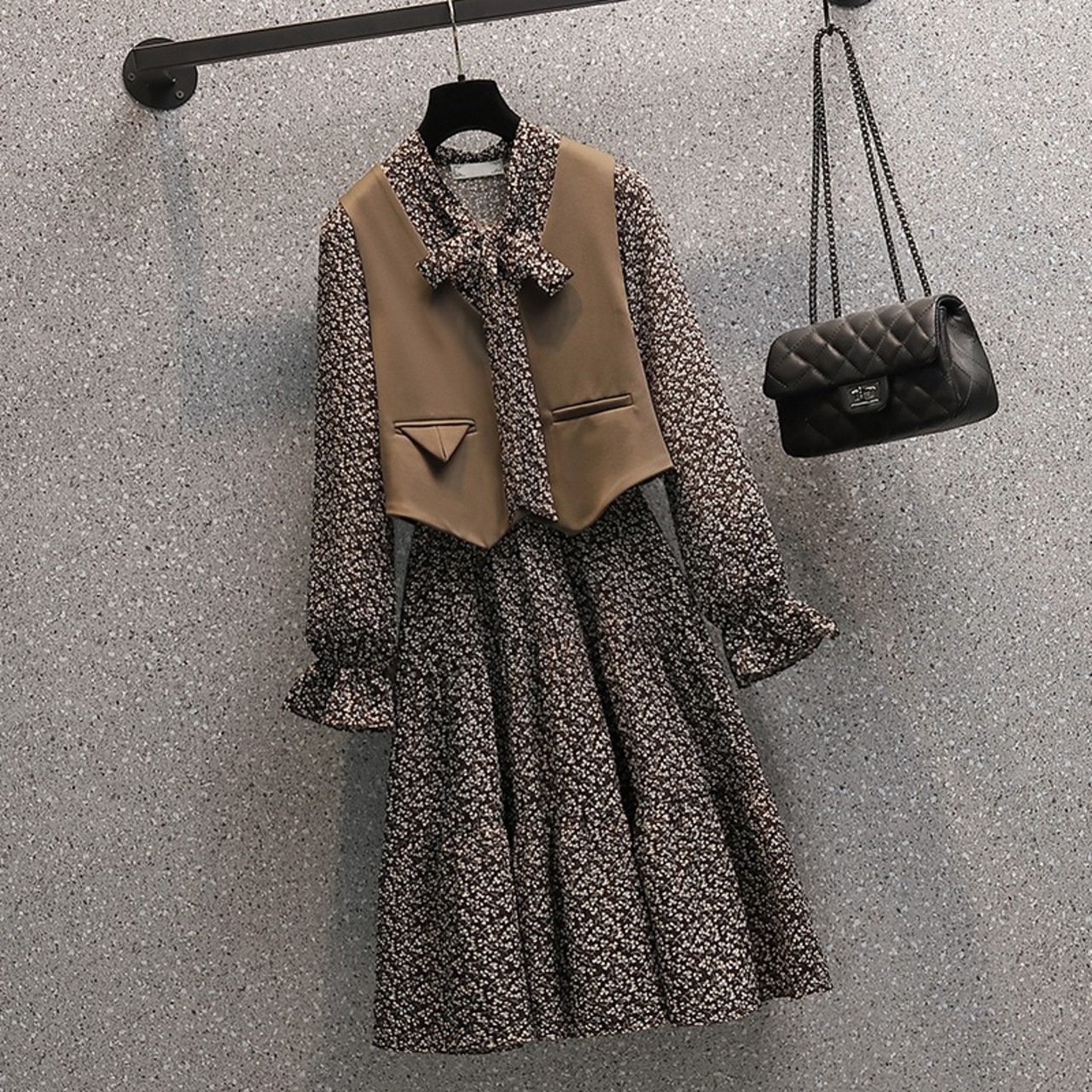 【セットアップ】小花柄ワンピース ベスト リボン フレア ひざ上丈 秋冬 大人きれい 10代 20代 30代 40代 50代 st0303