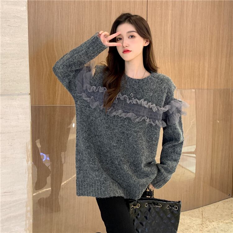 オープンショルダーニット フリル オーガンジー オーバーサイズ ざっくり 長袖 秋冬 大人かわいい カジュアル 10代 20代 30代 tp0979