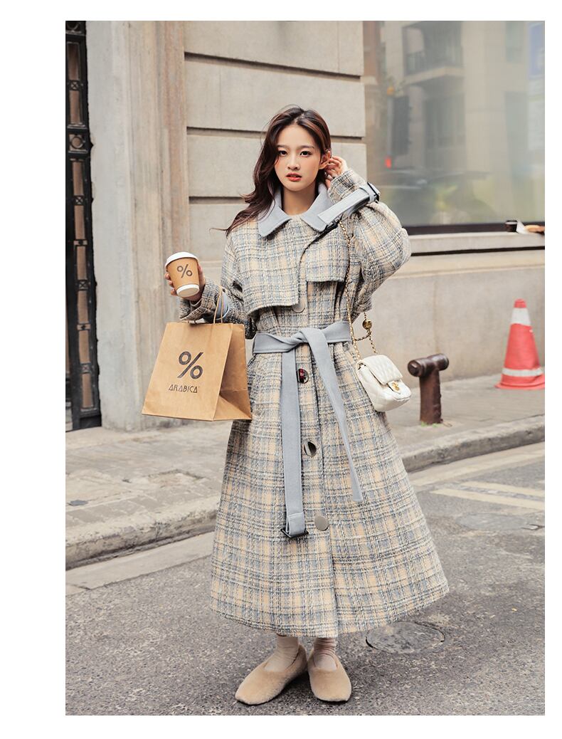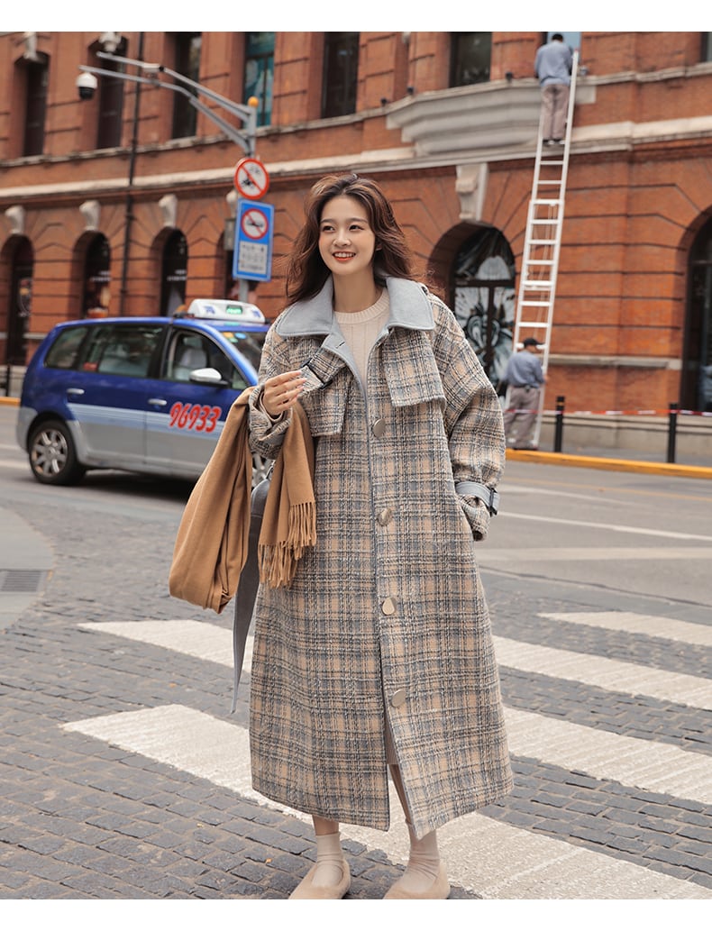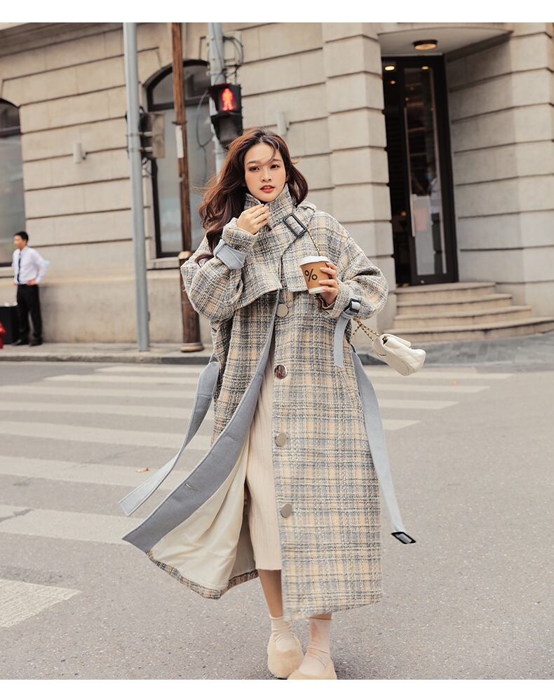 チェック柄のバイカラーコート。