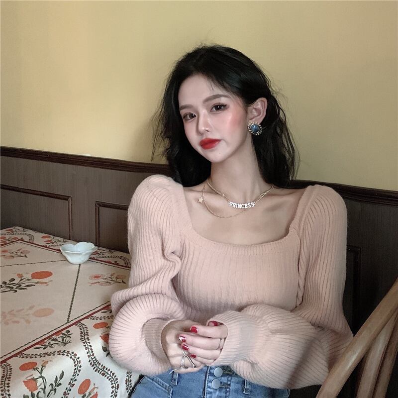 リブニット ランタンスリーブ ショート丈 スクエアネック デコルテ見せ 秋冬 大人きれい 10代 20代 30代 40代 50代 tp0993