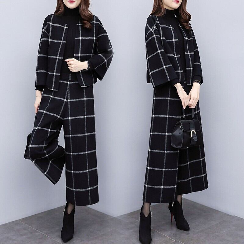 【セットアップ】チェック柄ウール調スーツ 八分袖ジャケット 九分丈ワイドパンツ ノーカラーカラー 秋冬 大人きれい オフィスコーデ 20代 30代 40代 50代 st0316