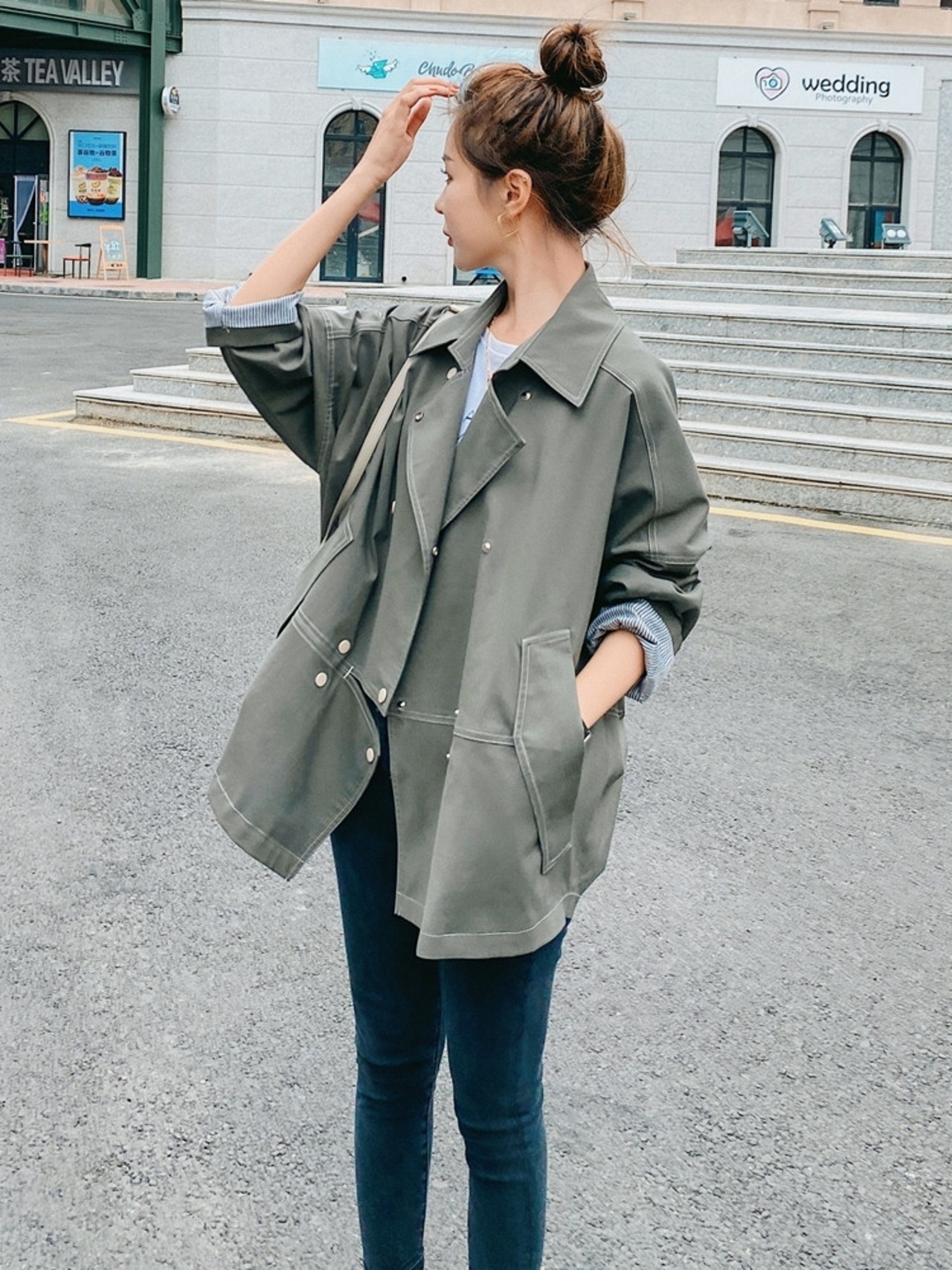 トレンチ風の襟や袖口にカットデザインを加えたおしゃれアウター。
