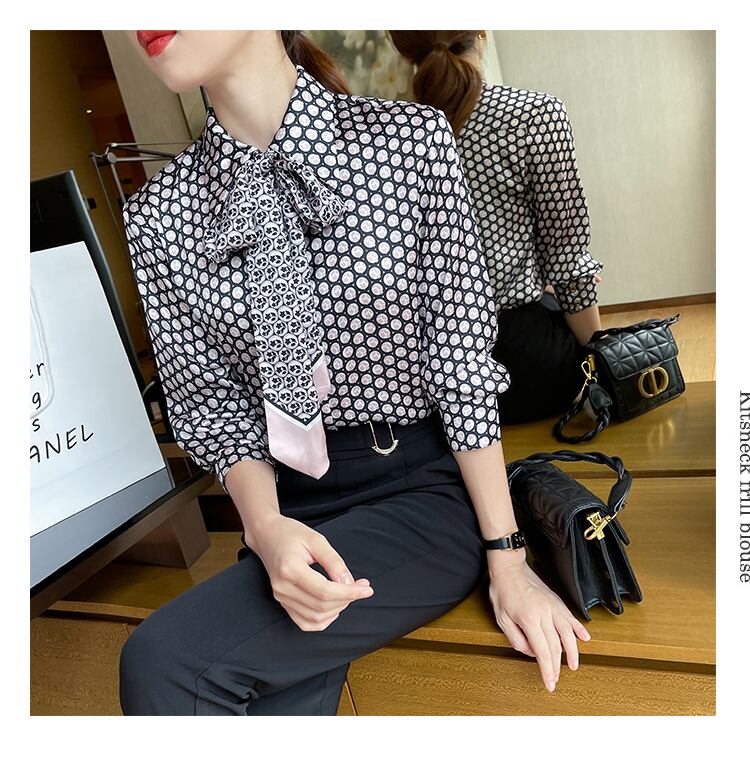 柄プリント シフォンブラウス シャツ 長袖 襟付き リボンタイ 春秋 大人きれい オフィスコーデ 20代 30代 40代 50代 tp1023
