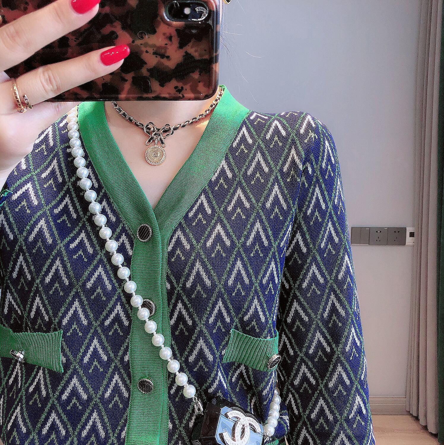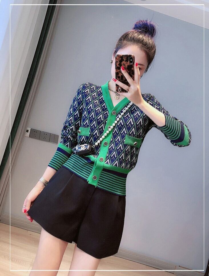 レトロ柄が新鮮なVネックカーディガン。