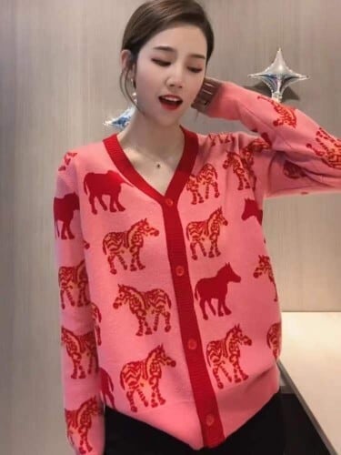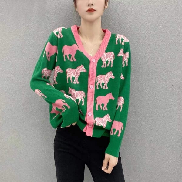 Vネックニットカーディガン ゼブラ柄 長袖 春秋 大人かわいい 10代 20代 30代 40代 tp1035