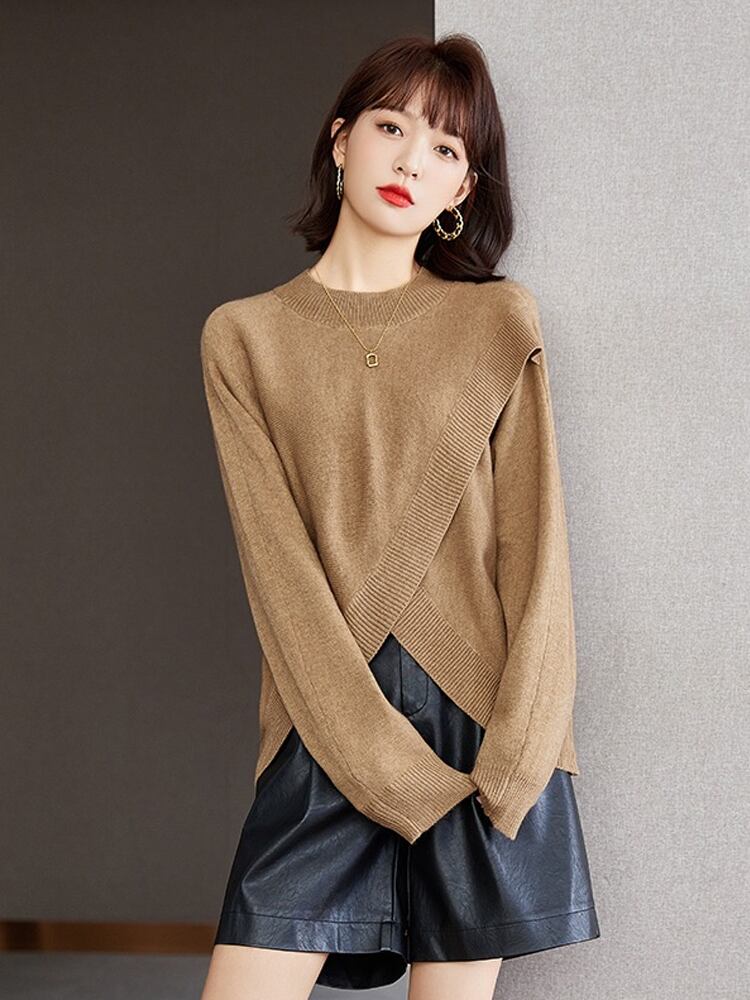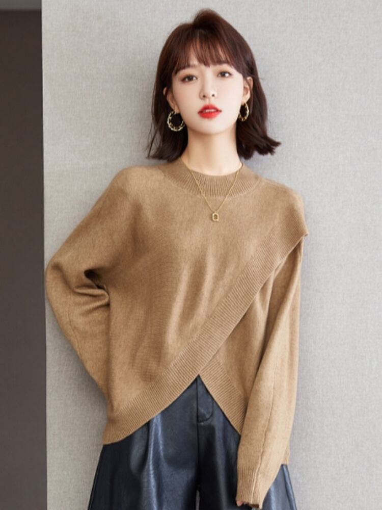 変形カシュクールニット ラウンドネック プルオーバー 長袖 春秋 大人かわいい カジュアル 10代 20代 30代 40代 50代 tp1040