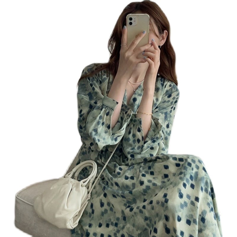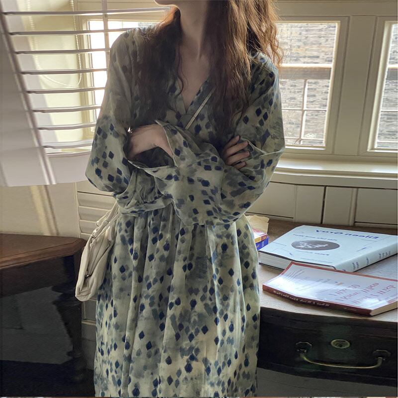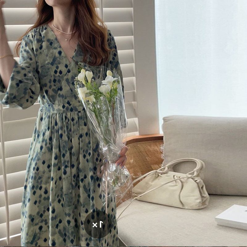 レトロフレンチ プリントフレアワンピース Vネック 春夏 大人きれい エレガント20代 30代 40代 50代 op0702
