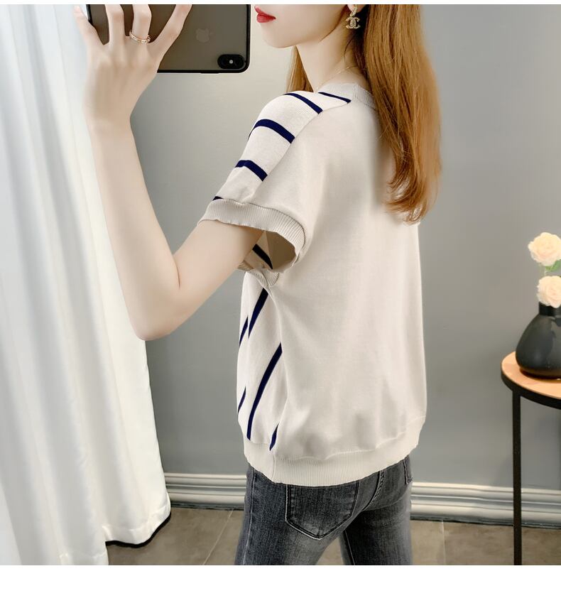 カシュクール風ニットソー ストライプ Vネック 半袖 薄手 春夏 大人きれい 20代 30代 40代 50代 tp1080