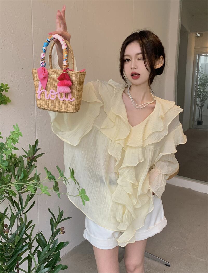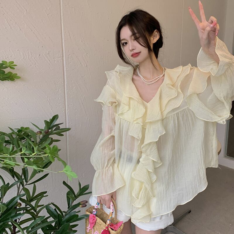 シアー シフォンブラウス フリル シャツ 透け感 しわ加工 長袖 オーバーサイズ 春夏 大人かわいい 10代 20代 30代 tp1086